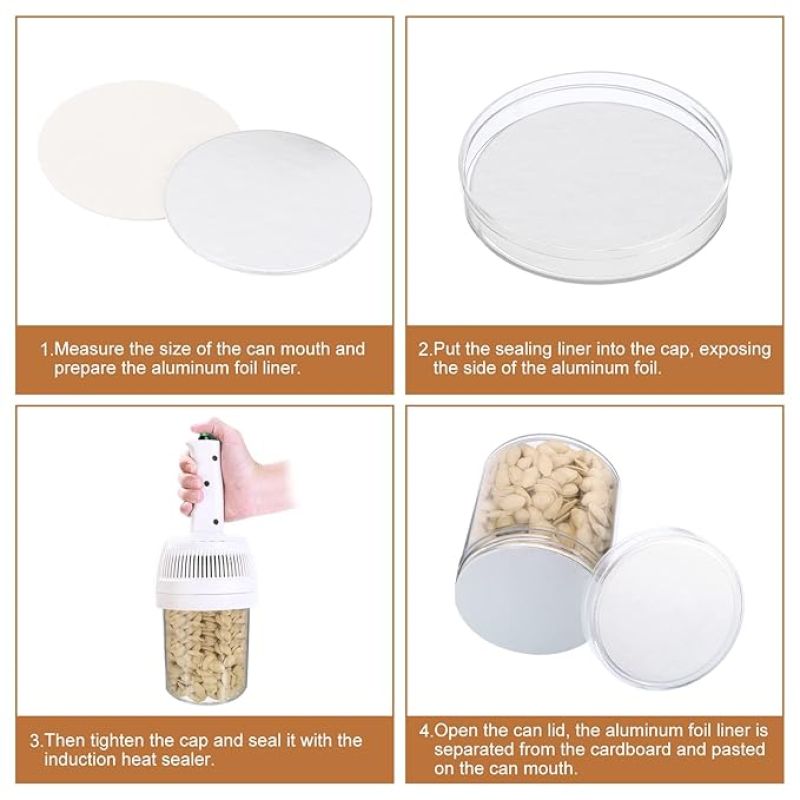 - Instruction: 1. Measure the inner diameter of the bottle cap. If there is a gasket in the bottle cap, you can also measure the size of the gasket; 2. Put the sealing liner into the bottle cap, exposing the side of the aluminum foil; 3. Then tighten the bottle mouth and seal it with the induction heat sealer.